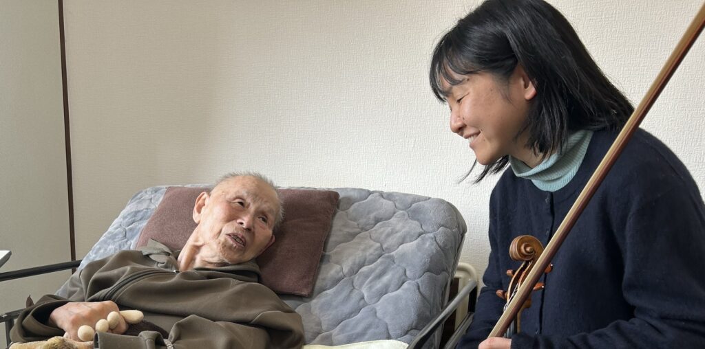 日本フィルハーモニー交響楽団のバイオリニストの方がお越しくださり、寝たきりで過ごされているファミリーのために、特別な演奏を届けてくださいました。披露されたのは、「アメイジング・グレイス」「荒城の月」「ふるさと」の三曲。